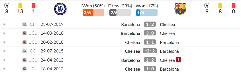 Trong 6 lần gặp nhau gần đây ở các đấu trường, Chelsea thắng 3, hòa 2 và chỉ thua 1 trước Barcelona. Những ký ức Champions League giữa hai đội rất đậm đặc cảm xúc: từ những trận hòa đầy kịch tính, những lần lội ngược dòng cho đến các bàn thắng quyết định ở những phút cuối.